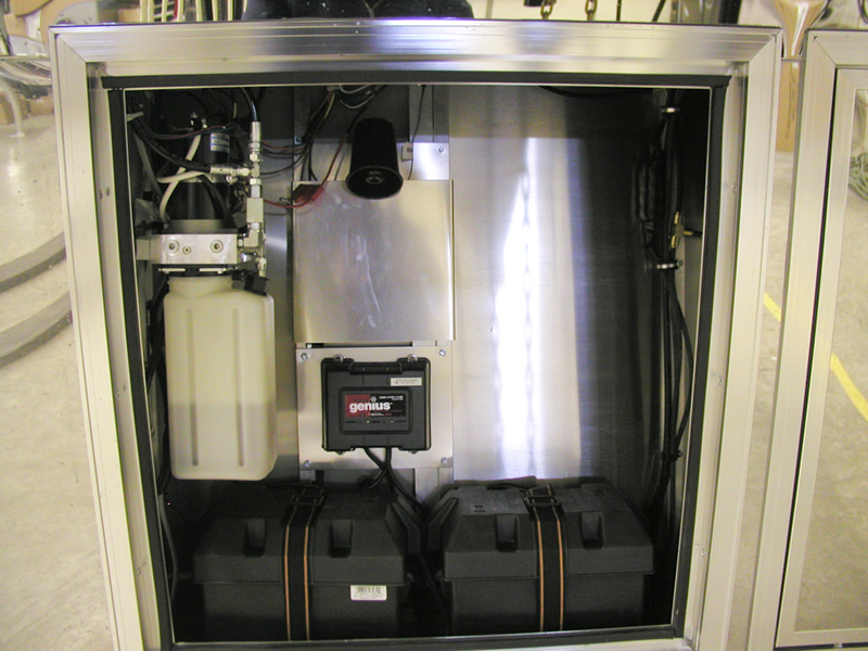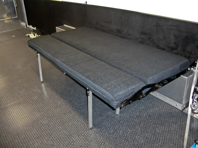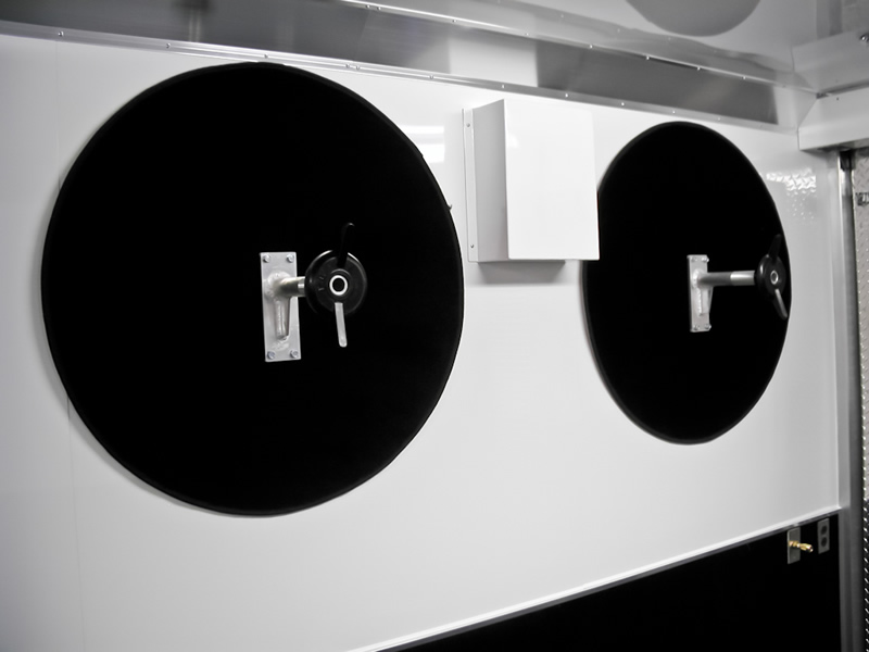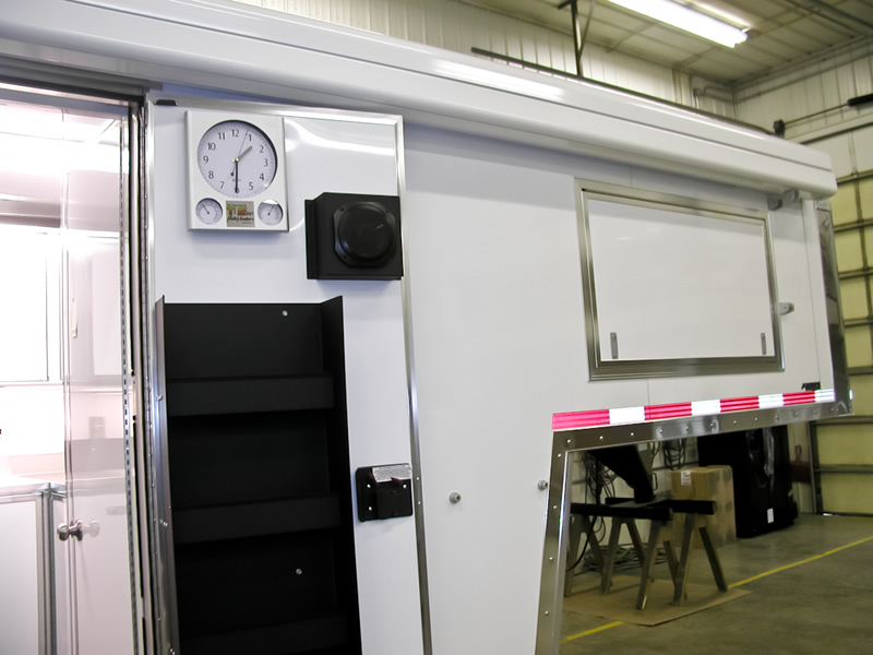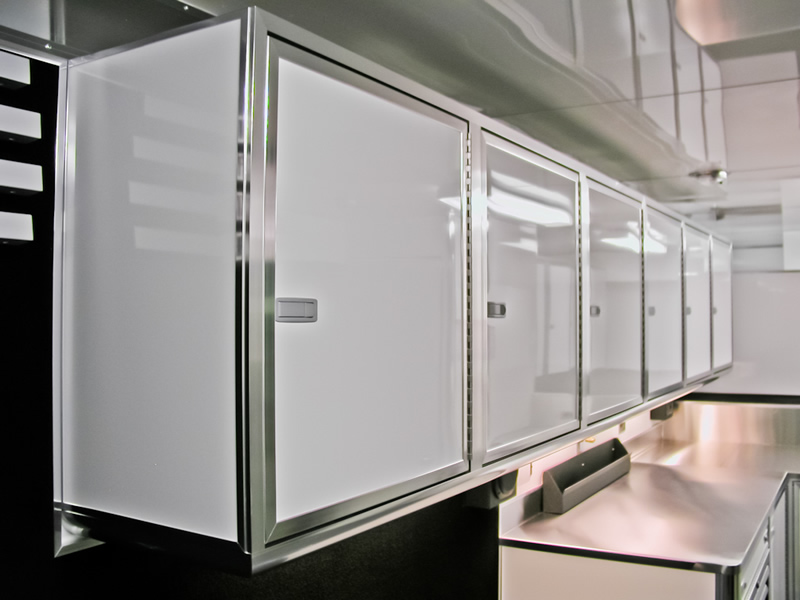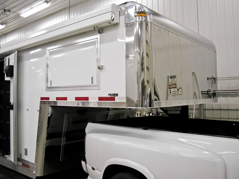 This 45' overall, 37' floor trailer features a polished stainless radius front end with an optional rivetless .063 wall exterior. Recessed quartz lighting units on the pit side wall provide plenty of nightime illumination and a pair of powered 22' Girard awnings give Tom and Jerry shade from the blazing hot sun out west. A special compartment in the curb side upper deck of the trailer features custom interior cabinets with an exterior flip up door to allow access to refreshments, snacks and other necessities in the pits.