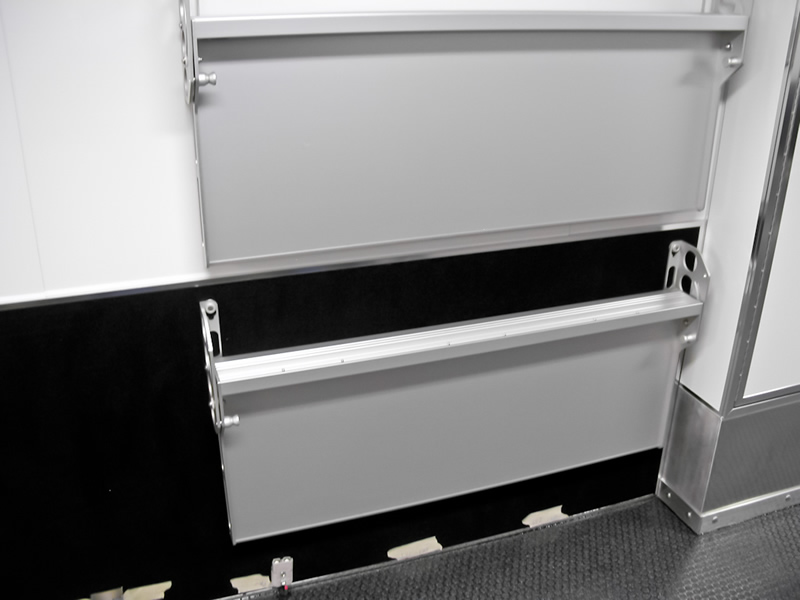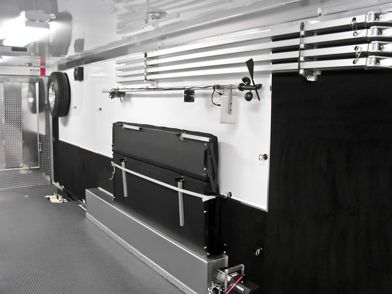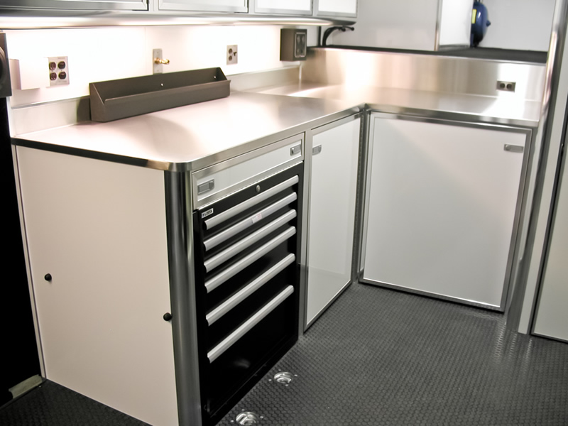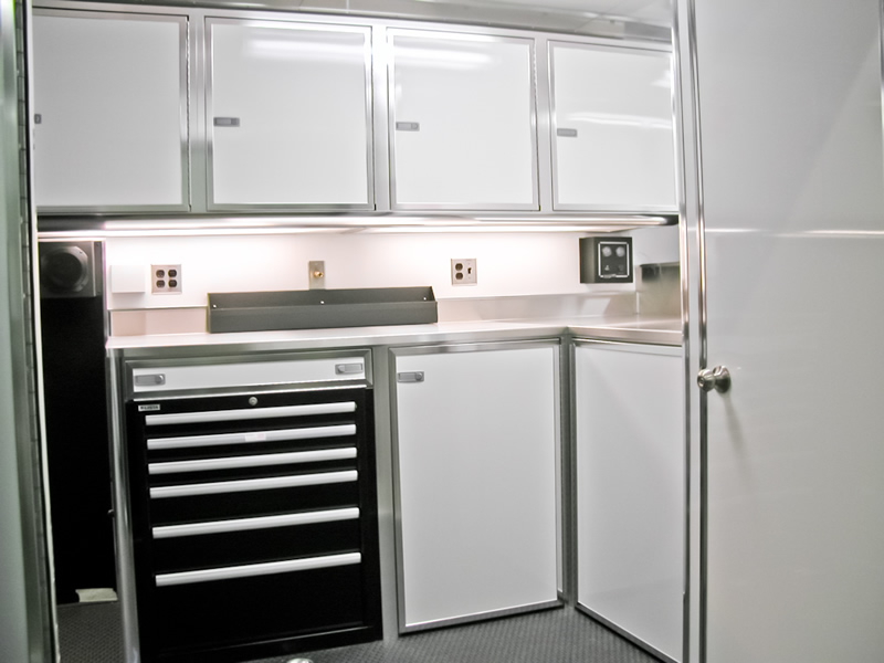 Note: Work and car storage areas in T&E trailers can be custom configured to your unique requirements. We welcome your personalized ideas and can custom build most anything you desire. We also can acquire and install name brand pit accessories for you. |