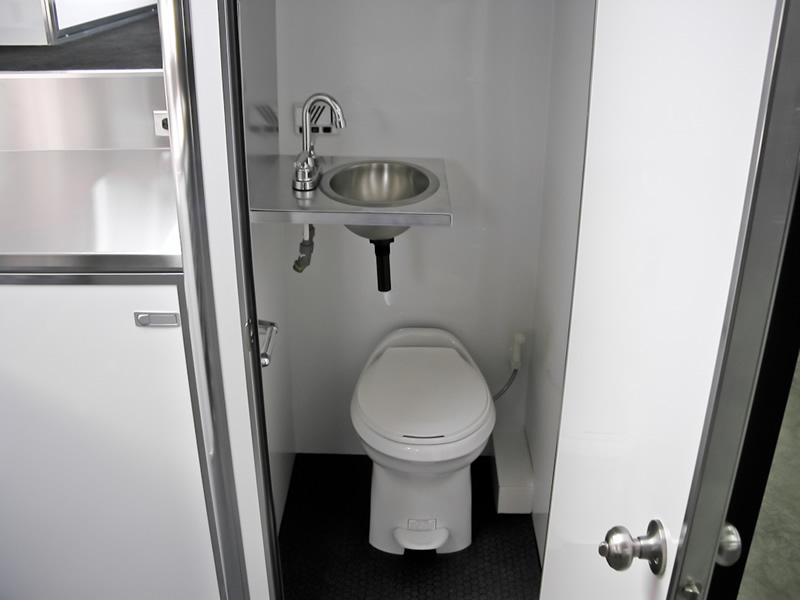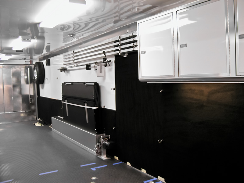 Entering into the trailer via the optional 56" double side door and sliding glass door units you'll find a fully insulated, sheeted and air conditioned work and car storage area. Plenty of interior lighting is provided by a combination of optional light packages on the ceiling of the trailer as well as under the top cabinets. Electricity is provided by an upper deck mounted Powertec 12kw generator package which is accessible from the outside of the trailer as well as the inside of the upper deck and it pulls fuel from an onboard 40 gallon aluminum fuel tank. An upper deck mounted air compressor provides pressure to the conveniently located exterior and interior air outlets. A bathroom is located in the front curb side of the trailer and an optional water package provides water to this area as well as to the portable sink which mounts on the exterior of the curb side upper deck. The interior side walls of the trailer are carpeted and there is are plenty of storage cabinets including a large curb side full height storage cabinet over the fender wells. Other interior features include Arrow flip style benches, fuel jug rack, Pro-Jack holders, ratchet strap holders and aerosol can racks to name just a few. To further visualize what T&E is capable of, please take a moment to tour through Tom and Jerry's trailer via the photo galleries below. You may also Download a PDF Photo Pack which contains all the images below.